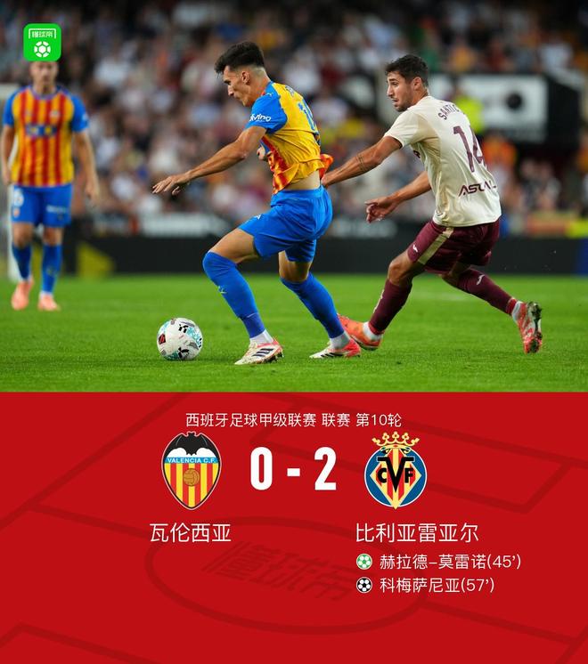北京时间10月26日,西班牙足球甲级联赛第10轮展开较量,瓦伦西亚坐镇主场迎战比利亚雷亚尔。比赛中,比利亚雷亚尔率先打破僵局,赫拉德-莫雷诺主罚点球命中,为球队取得领先。随后,科梅萨尼亚接应进攻再下一城,帮助球队扩大优势。最终,比利亚雷亚尔以2比0客场战胜瓦伦西亚。